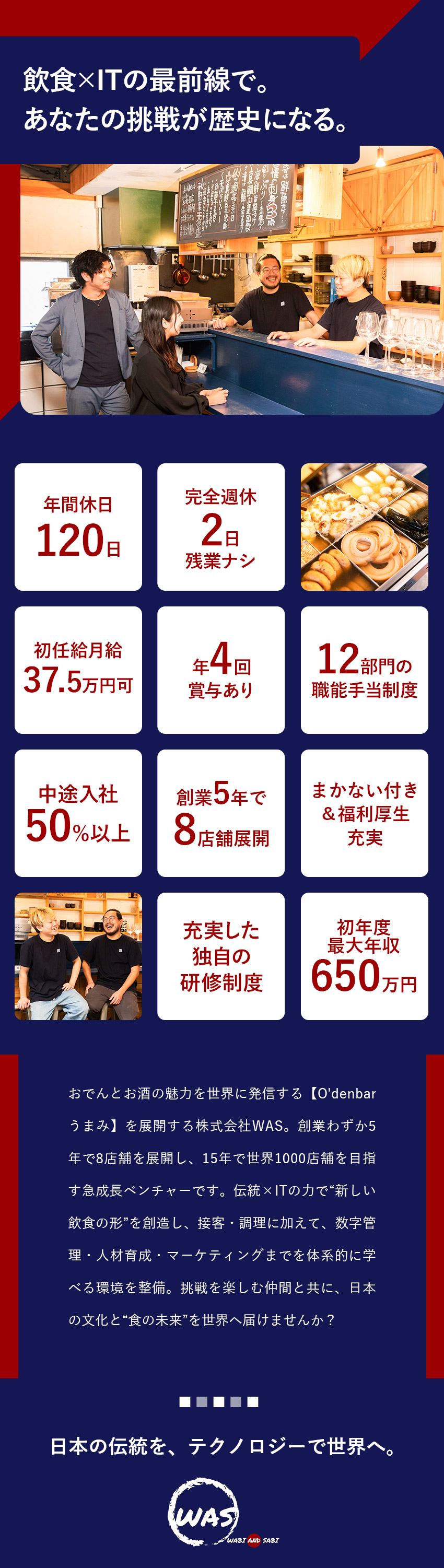 WASは、教育体制がとても丁寧で、未経験からでも安心して成長できる環境です。接客スキルはもちろん、経営・IT・人材育成といった“飲食の枠を超えた力”を身につけられます。入って後悔させません!