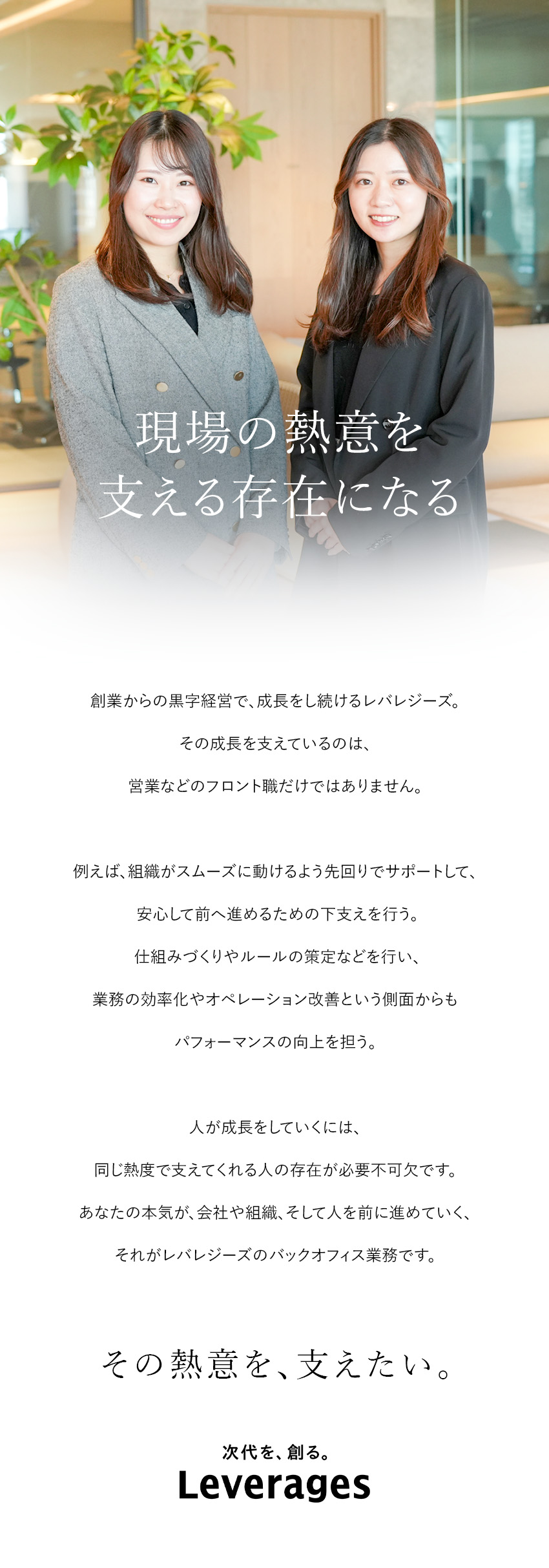 チームは、柔軟で影響力の高いオペレーションを目指し、最新技術やシステム連携を積極的に活用しています。事務という立場ではあるものの、営業現場の動きを理解し、改善のために試行錯誤を重ねていくため、フロントと同じ熱度で仕事を担える立場です。また、レバレジーズでは多様なキャリアパスが描けるので、積極的な挑戦をしてほしいと思います」