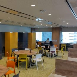 フリースペースでランチをしたり休憩したり。同ビル内にコンビニやお弁当屋さんもあり、便利です!