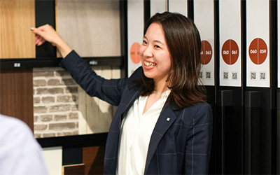 入社後は先輩に同行して完成現場やショールームを見て回り、意匠提案やトークの練習を行いながら勉強していきました。完全未経験でしたが、先輩への質問や自主学習を行い、2カ月で独り立ちすることができました!