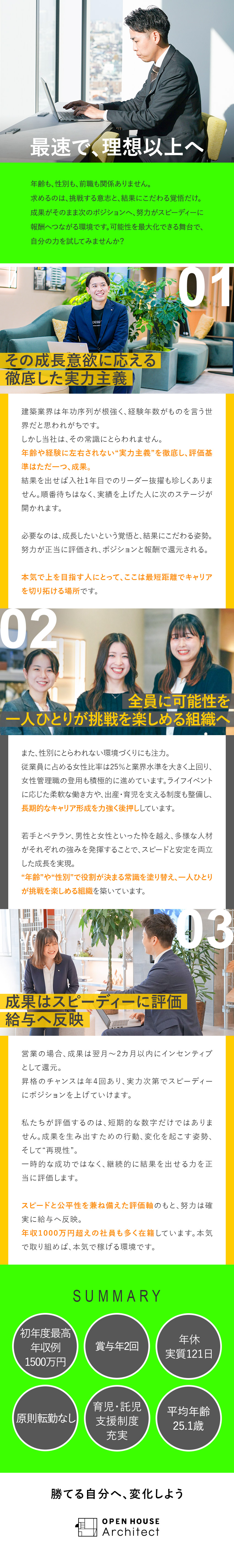 年齢や社歴にとらわれることなく「成果」と「挑戦」を正当に評価し、その結果をスピーディーに給与やポジションへ反映します。