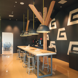 お洒落なラウンジのカフェはお客様にも好評!また、キッズコーナーも設けています!(写真は小山店)