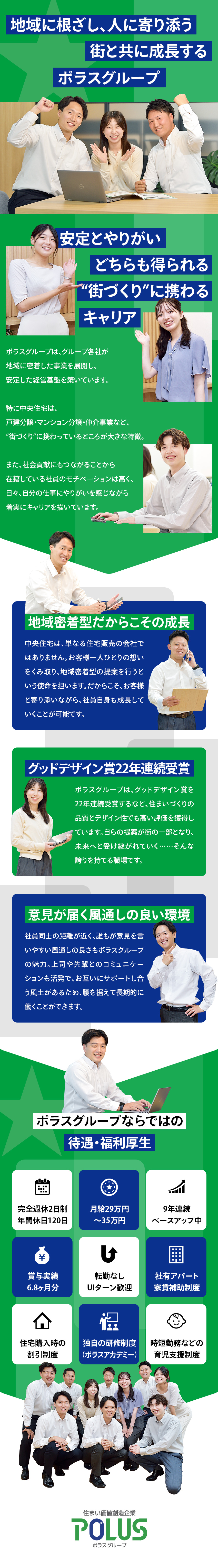 お客様に直接感謝の言葉をいただける機会も多く、大きなやりがいやモチベーションに繋がるそう。ただ売るのではなく、住宅を通して住みやすい街づくりに携われるのは“ポラスグループ”ならではの強み。出費が大きいからこそ、迷いや不安を抱えているお客様を、いつでも相談できる身近な存在である立場に誇りをもってご活躍いただきたい。