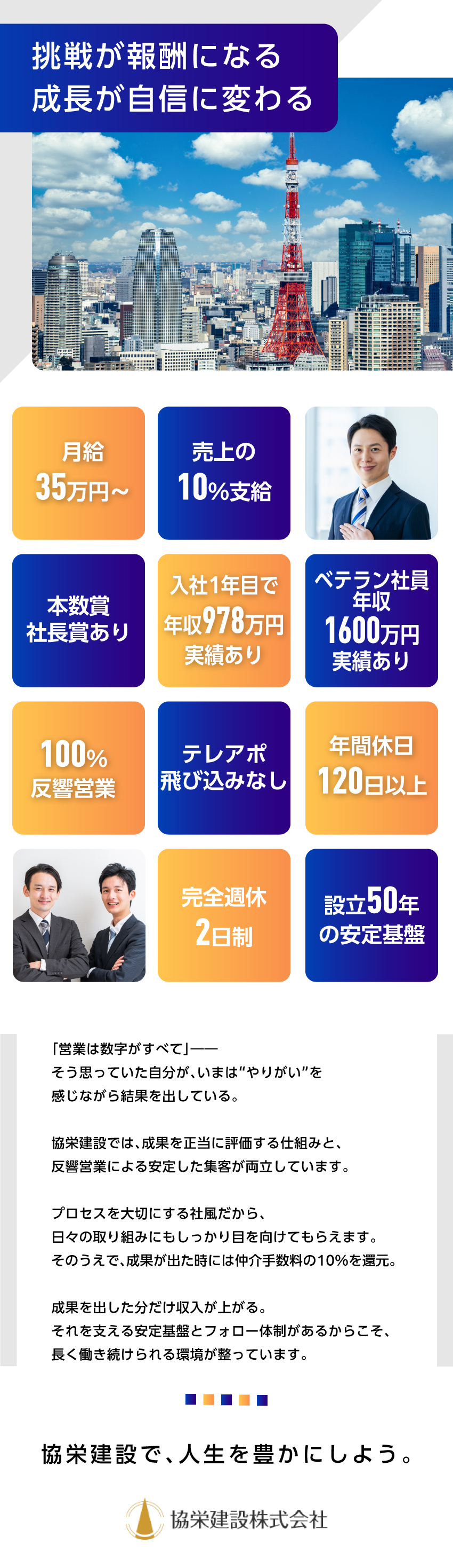 協栄建設では飛び込みもなく、反響や紹介からの提案が中心です。お客様にしっかり向き合える環境で、成果は歩合でしっかり評価されます。頑張りがそのまま収入に反映されるので、やりがいを感じます!