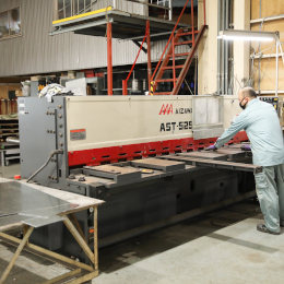 ダクトの製作に必要となる亜鉛鉄板は、工場長が専用の機械で手動で切断し作っています。