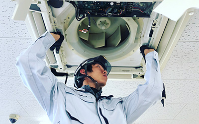 ┗空調設備のメーカー研修や、未経験者向けのスキルUP研修などで、設置工事やメンテナンスの技術を磨きます。