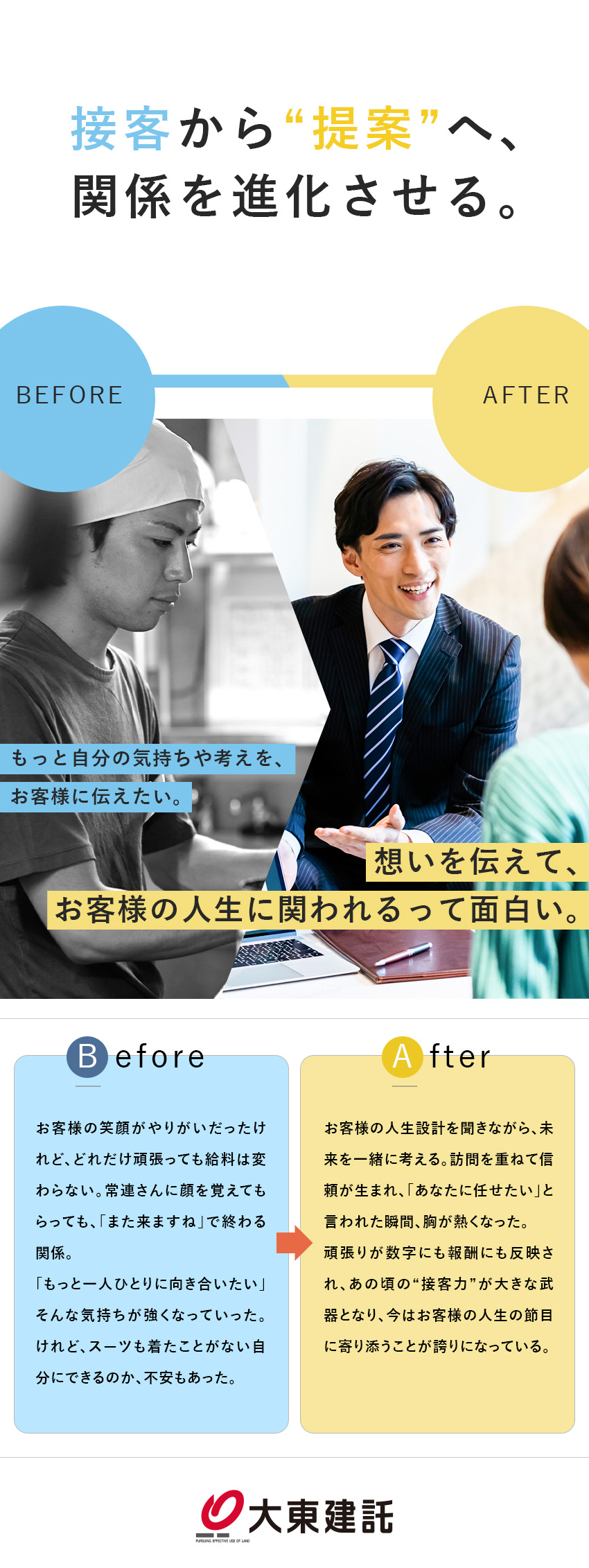 土地オーナー様とそのご家族の大切な資産を任せていただく責任と誇りが、大東建託の営業職のやりがいです。