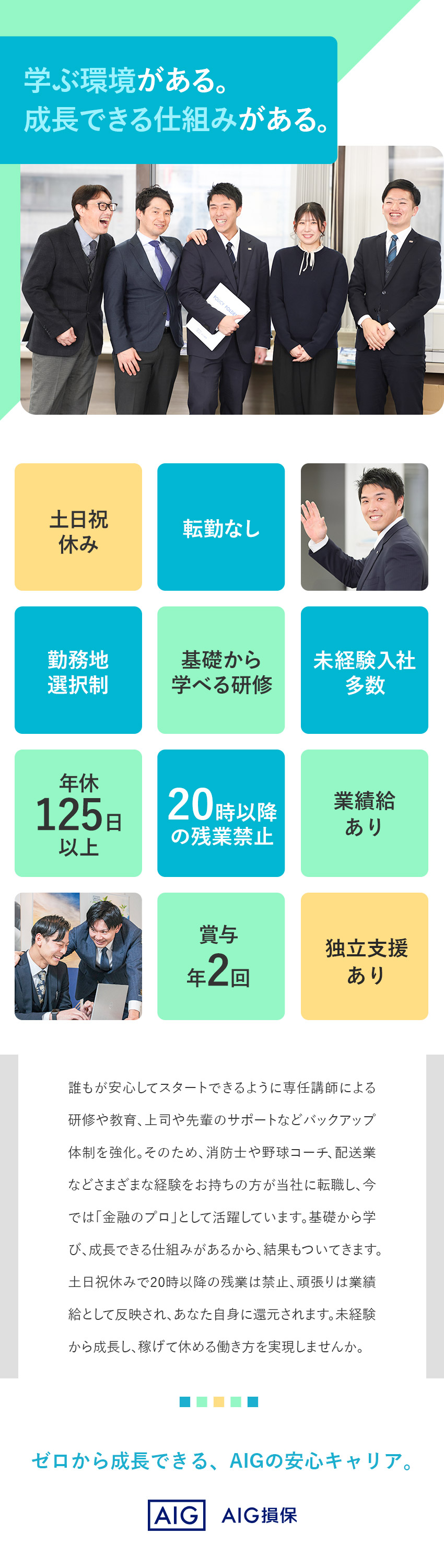 イチから知識を身に付け、サポートを受けながら経験を積んでいけるため、特に未経験の方は自分の成長もやりがいにつながるでしょう。お客様に真摯に向き合うことで信頼関係を構築し、損害保険のプロとして頼られる存在になれば、そこでついた自信がさらなる推進力となるはず。頑張りは給与やスキルとして自分に返ってくるので、モチベーション高く仕事に取り組めます。