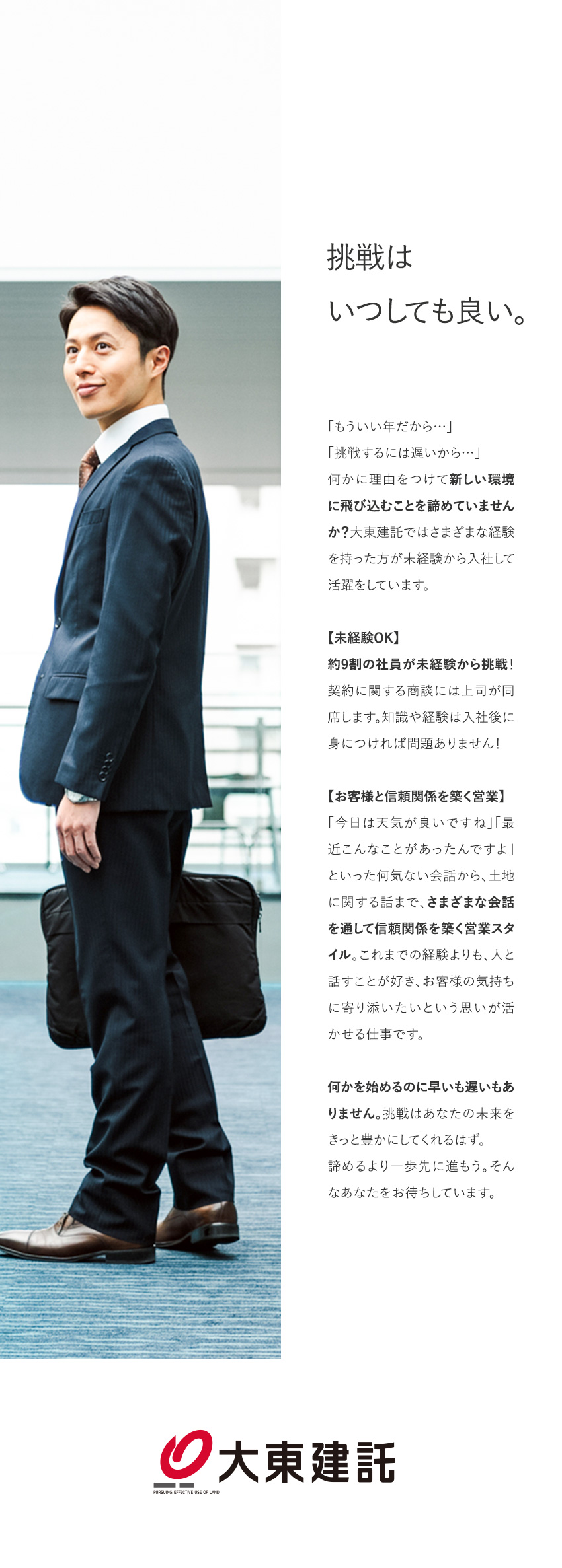 土地オーナー様とそのご家族の大切な資産を任せていただく責任と誇りが、大東建託の営業職のやりがいです。