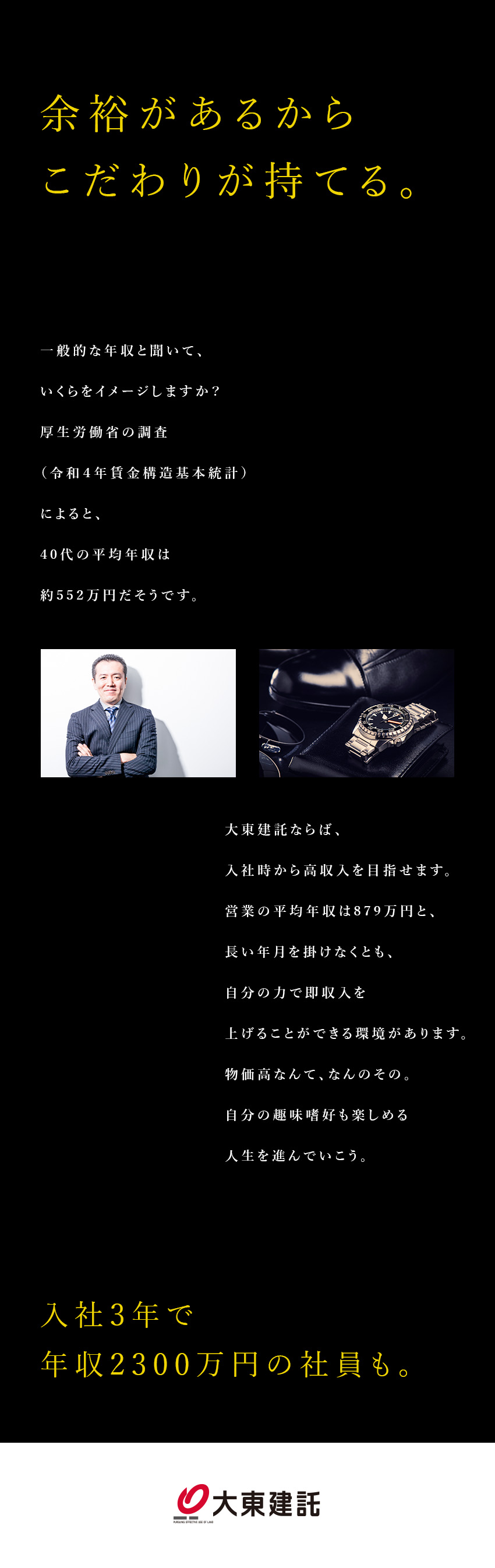 元々、歩合の仕事にしか興味がありませんでした。さぼってる人と頑張ってる人が同じ給料なんて、納得いかないじゃないですか。やればやった分だけ稼ぐことができること。それが大東建託に入社した一番の理由です。
