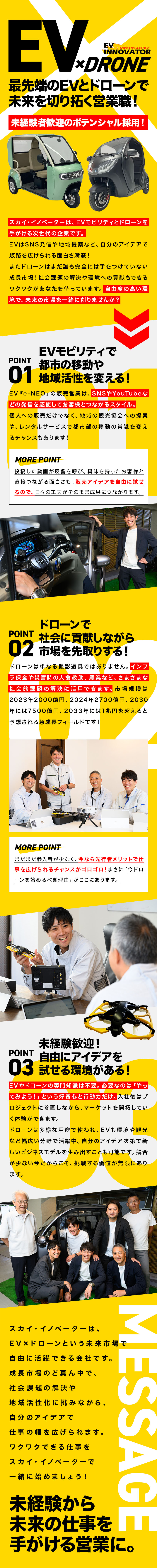 ドローンもEVも環境という観点で、大変将来性が高いビジネスです。また活用用途も無限に広がっています。ますます広がる成長市場のど真ん中で、一緒に仕事を楽しんでいきましょう!