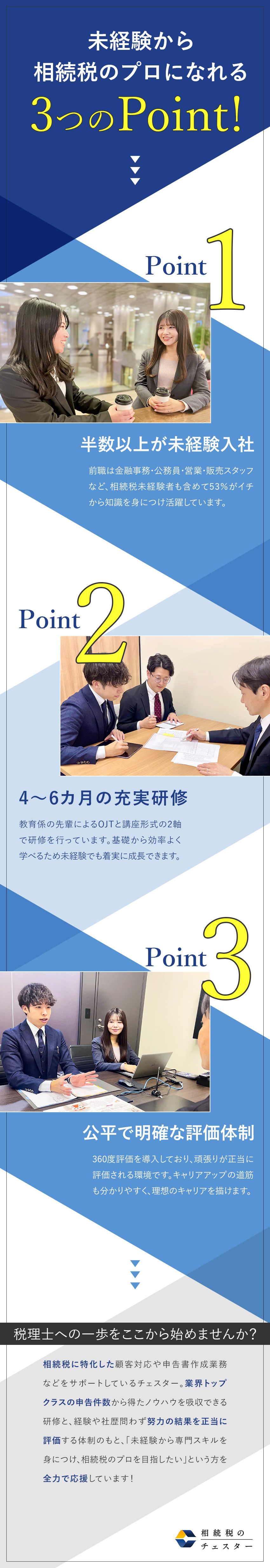 超高齢化社会を迎える将来、「相続」に困る人が増えていくことが予測されています。そのニーズの高さに比べ、相続税のプロフェッショナルはまだまだ少ないのが現状。相続税申告業務に専念できるチェスターでは、お客さまにじっくり寄り添い「ありがとう」と感謝されるやりがいを味わうことができます。また、実践を通じて専門性の高い知識を身につけられるため、自身の市場価値を高められるでしょう。