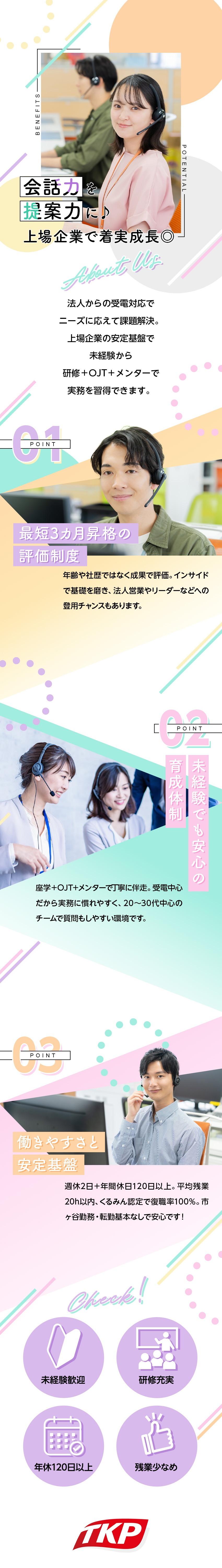 法人や団体から寄せられる「会議室を予約したい」「イベントを開催したい」といった問い合わせに対し目的・人数・日程を伺いながら最適な会場や備品、レイアウトを提案します。受電の提案型サポート職です。