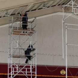 屋内スポーツの支柱を設置する床金具の取付けなど。