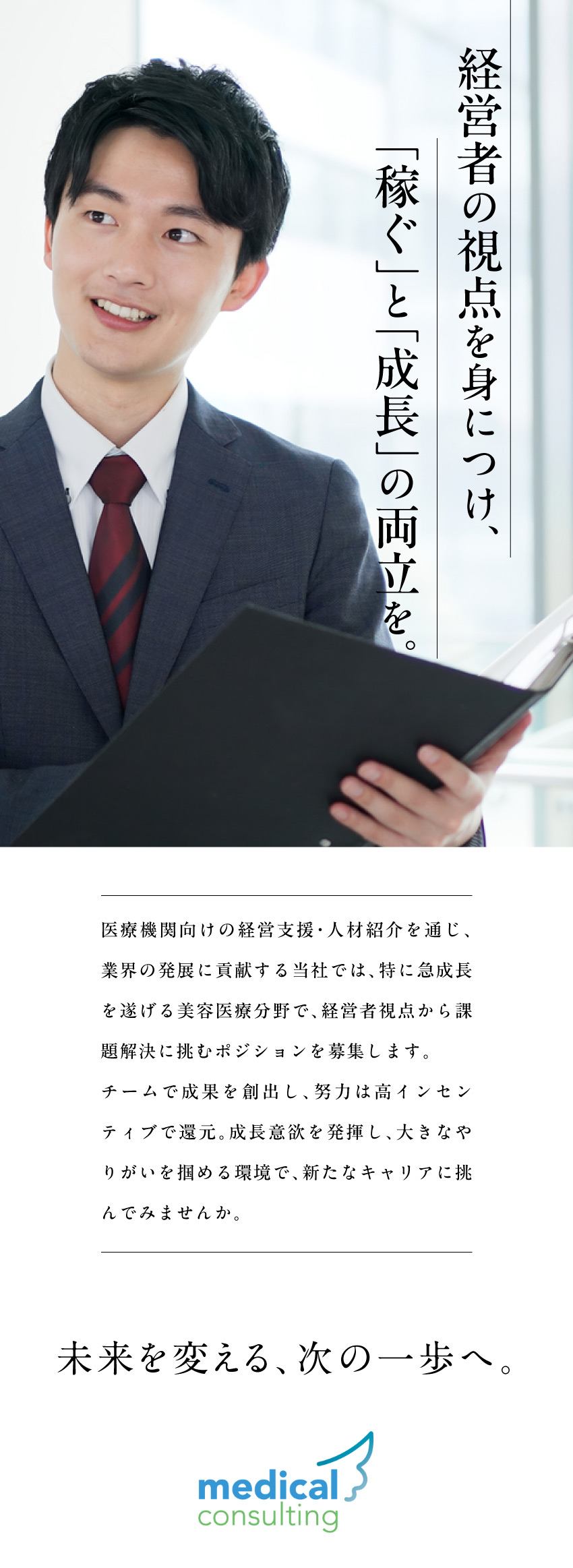 院長・理事長などの経営者と向き合いながら課題を解決していく仕事なので、“売る”だけではなく、経営の考え方や数字の見方も自然と身につきます。営業経験を活かしながら、ひとつ上のステージを目指せます。