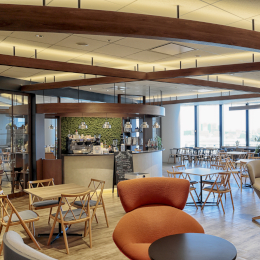 本社の社内カフェにはバリスタが常駐。オフィスのいたるところに本物の草木もあり、リフレッシュできます。