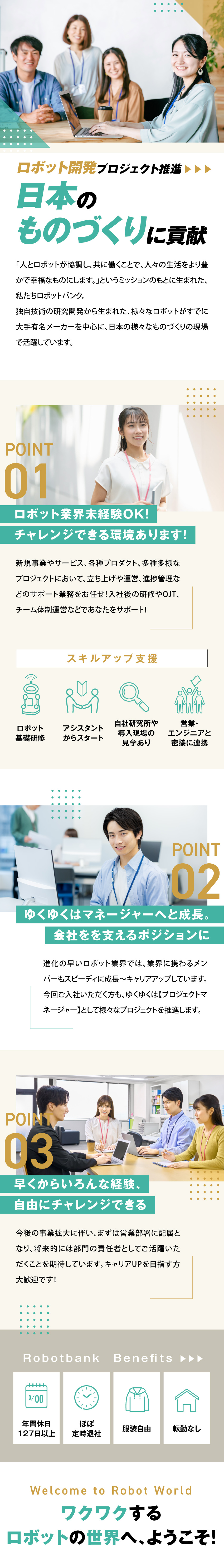 自社ロボットを中心とした各種開発プロジェクトを推進・進捗管理する立場として、営業やエンジニアなどと連携しながら着実かつ丁寧に対応していきます。その結果、無事にプロジェクトが完了してお客様が求めるロボットやシステムが導入。日本各地の様々な工場・ものづくり現場の最前線でロボットが活躍することで、広く貢献できるやりがいがあります。