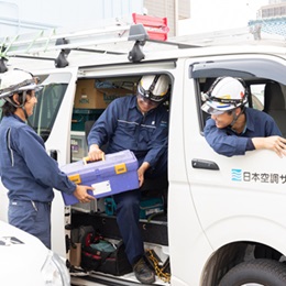 社用車で1日に1~2現場を訪問し、空調などの設備の点検、整備、修理などを行います。