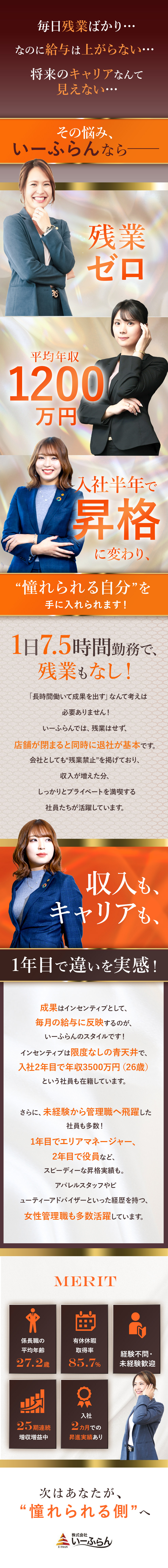 若手エリアマネージャーの神谷さんは、前職のスポーツインストラクターで培った顧客折衝経験を活かしながら、スピーディに成果を出し、欲しいものを手にできています。残業禁止&平均年収1200万円のいーふらん、社員全員平等にチャンスが広がっています。