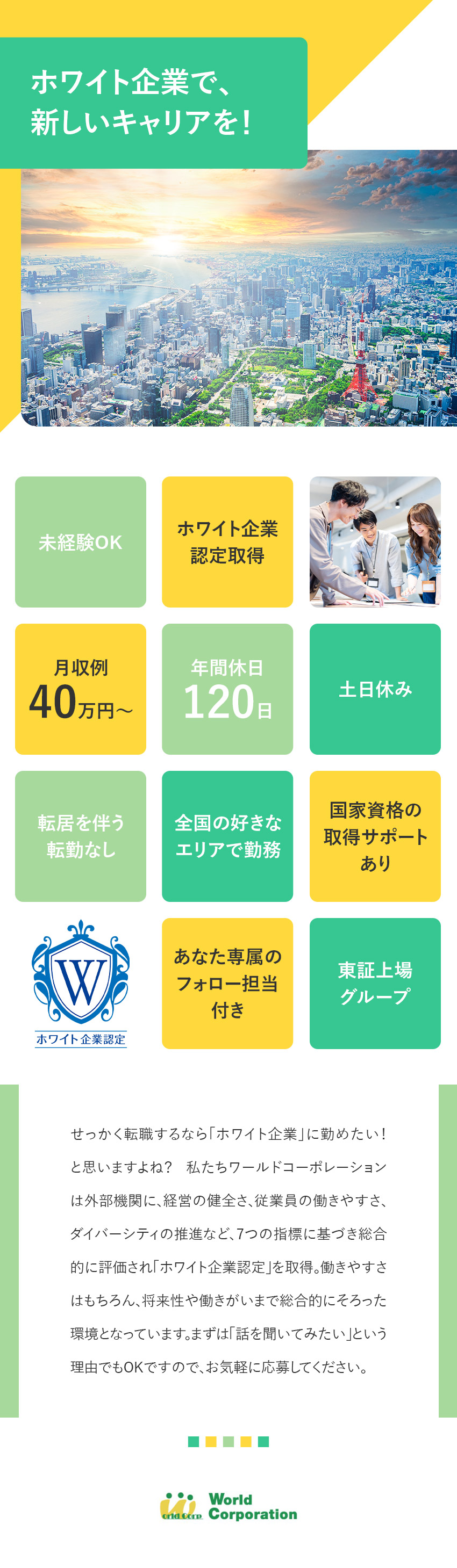 私たちワールドコーポレーションが重視しているのは、面接に来てくれた方の「将来を一緒に考えて、どうすれば良いキャリアが築けるか見つけること」です。 どのようなキャリアを磨いていけばちゃんと将来設計ができるのか、ワールドコーポレーションの中でどういった成長をすればスキルが身につくのかなどを、人事ならではの視点で丁寧にお教えしますし、あなたが納得する未来を一緒に考えていきます。