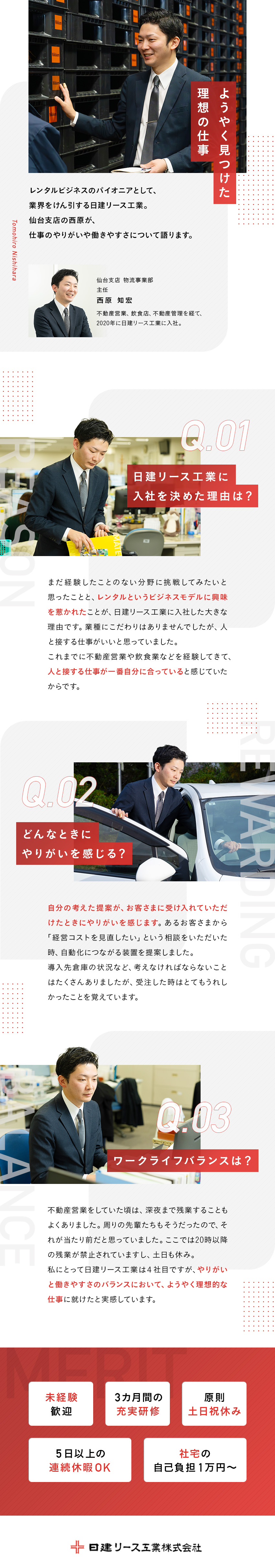「日建リース工業に転職して一番変わったのは、ワークライフバランスかもしれません」。そう語るのは、仙台支店・物流事業部の西原さん。もともと人と接することが好きで、これまでも不動産営業や飲食業などを経験してきましたが、慢性的な長時間労働が続いてきたそうです。「ここでは20時以降の残業が禁止で、土日もしっかり休めるので、プライベートの時間が格段に増えました」。日建リース工業へ入社して心にゆとりが持てるようになった西原さんは、2023年に結婚、現在は一児の父として頑張っています。「やりがいとプライベートを両立できる、理想的な仕事にようやく出会えて、毎日が充実しています」。