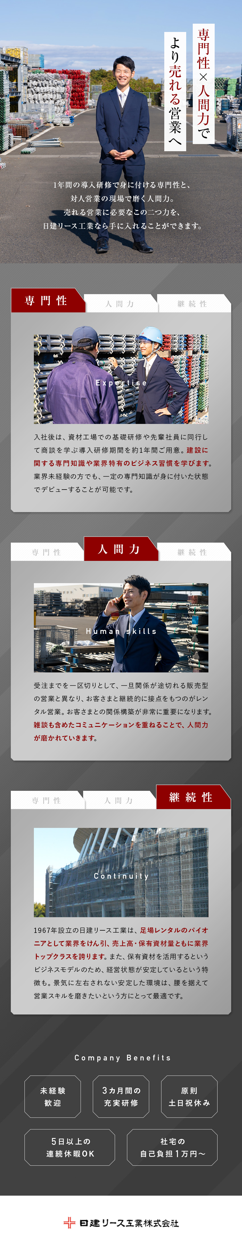 営業先は全て当社の既存取引先です。当社は仮設資材レンタルで業界トップクラスのシェアのため、引き合いも多数。提案業務に集中できます。