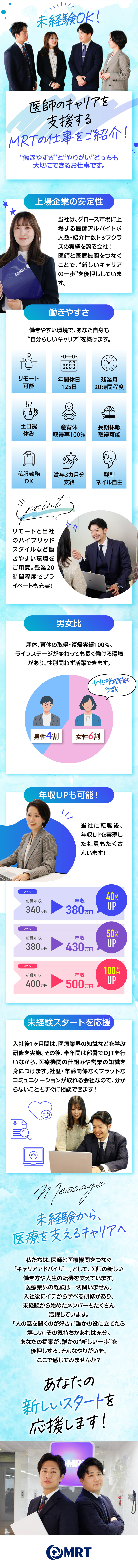 医師のキャリア支援を通じて、一人ひとりのキャリアを叶えるやりがいはもちろん、自分自身も働きやすい環境で、長くキャリアを積むことができます。同社ならではの温かい雰囲気を、ぜひ面接で体感してください。