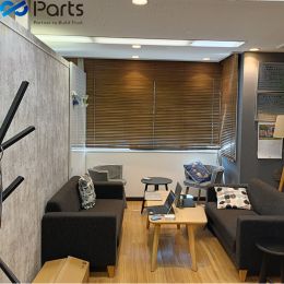『打合せスペース』オシャレなカフェのような雰囲気。ソファーの後ろに電子レンジやお水があります。