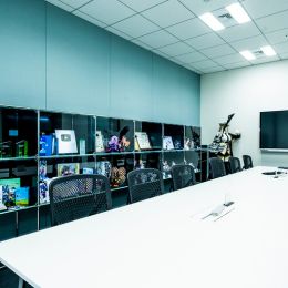 また働くオフィスも、仕事のモチベーションに繋がるのでは、と感じ、オタクの聖地「秋葉原」の駅前のオフィスビル内にあり、実際に中に入るとそれぞれのタイトルの等身大フィギュアやグッズが並び、ガラス張りの会議室が。