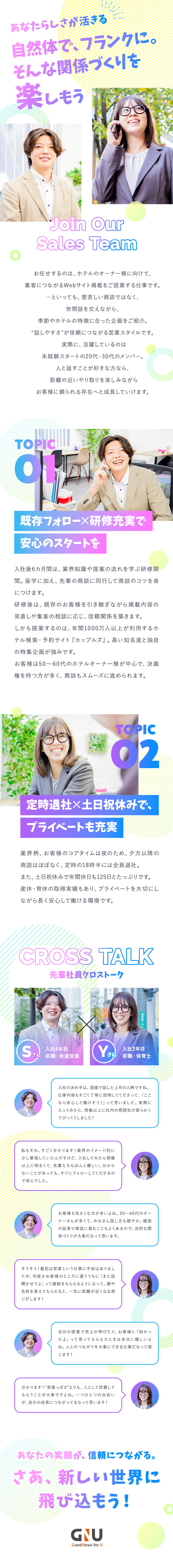 取材を通して感じたのは、“営業=数字を追う仕事”というイメージとは異なり、同社では“人との関係づくり”を大切にしているということです。提案する『カップルズ』は、年間1,000万人以上が利用する国内最大級のホテル検索・予約サイト。業界でも知名度が高く、話を聞いてもらいやすい商材です。さらに、入社後は6カ月間のOJT研修で基礎から学べるため、営業未経験の方も安心してスタートできます。