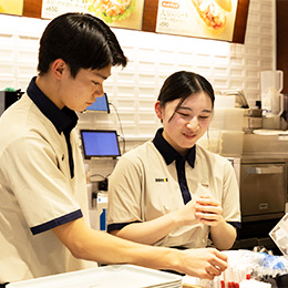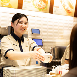 「カフェが好きという気持ちを原点に、お客さまに寄り添う接客や、心地よい空間づくりに憧れて入社しました」と話すのは、趣味が資格勉強のSさん。日常的に「メンバーからどんな質問がきてもすぐ答えられるよう、マニュアルを覚えています。また、コーヒー豆の味や産地などドトールへの理解を深める勉強もしています」と、向上心の高さがうかがえます。