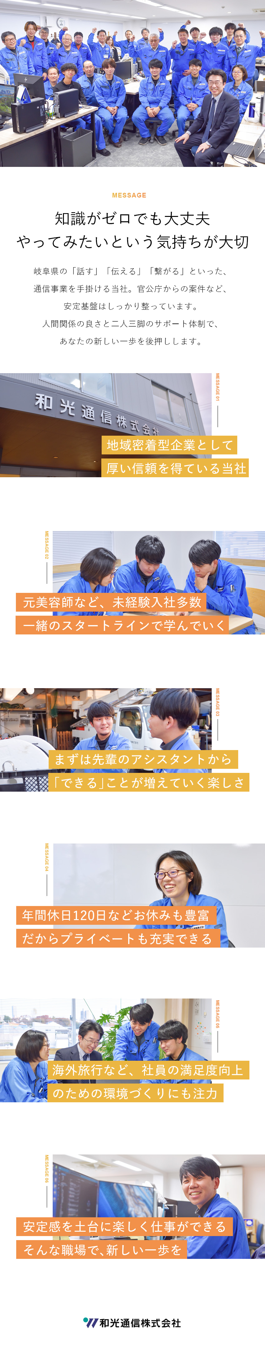 【経験・知識ゼロから育てます!】岐阜県内を中心に、電気・通信分野における電気通信系の工事を行います
