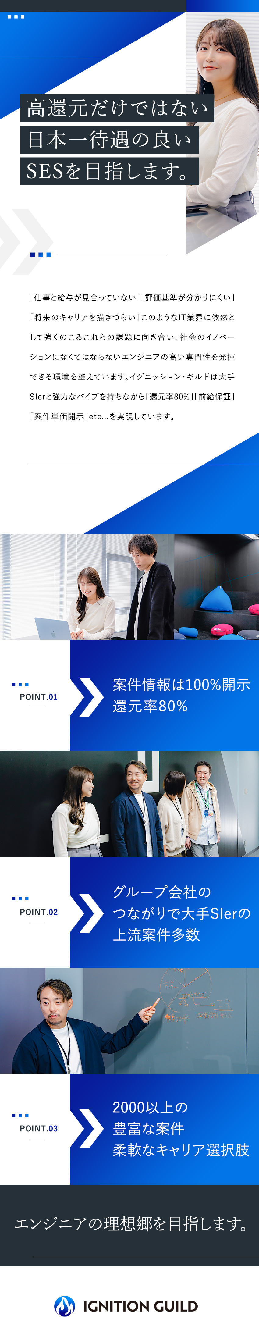 そこで、個々が自身の価値と向き合いながらも、自分らしくポテンシャルを発揮できるために、還元率の透明性・案件選択の自由・単価と連動した評価制度を導入。エンジニアへの貢献を惜しまない同社であれば、理想的なキャリアを実現できるでしょう。