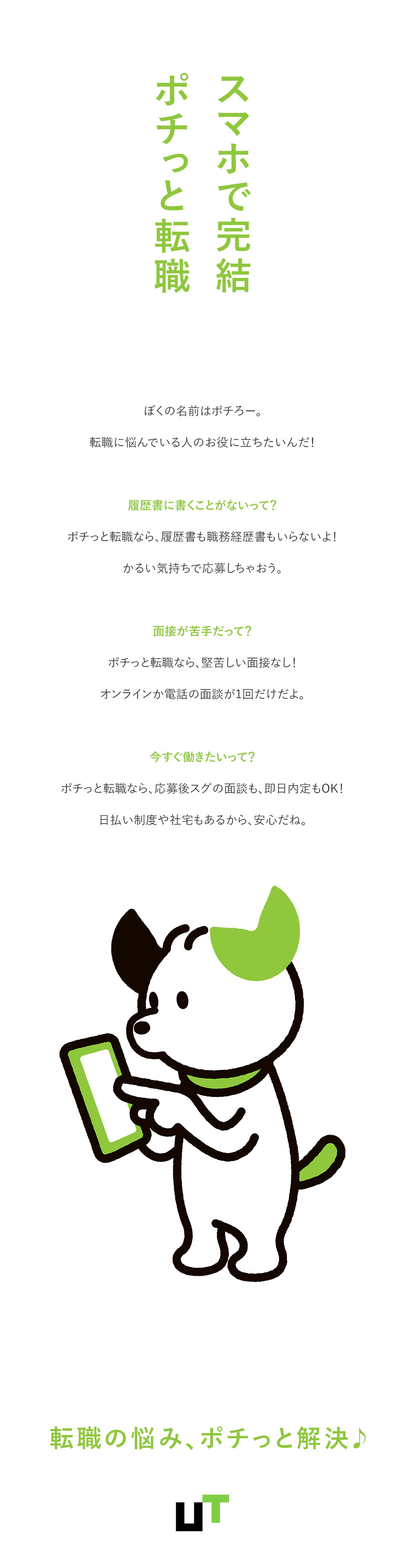 人と常に接する仕事に疲れてしまって、月給も安かったので一人暮らしを続けるのも大変で……。UTエイムでは接客やクレーム対応ないから対人ストレスなく、社宅補助があるので使えるお金が増えました!