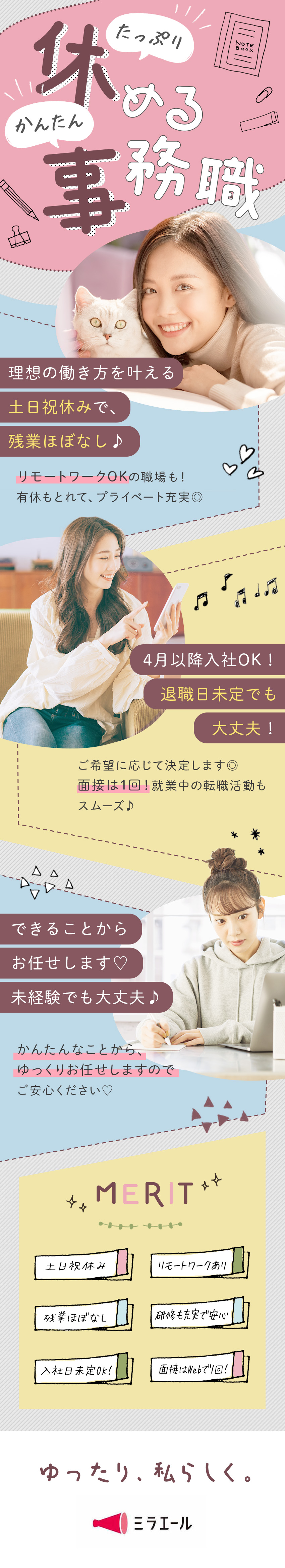 NEW締切間近ゆったり働ける事務/土日祝休み/原則定時退社/リモートあり