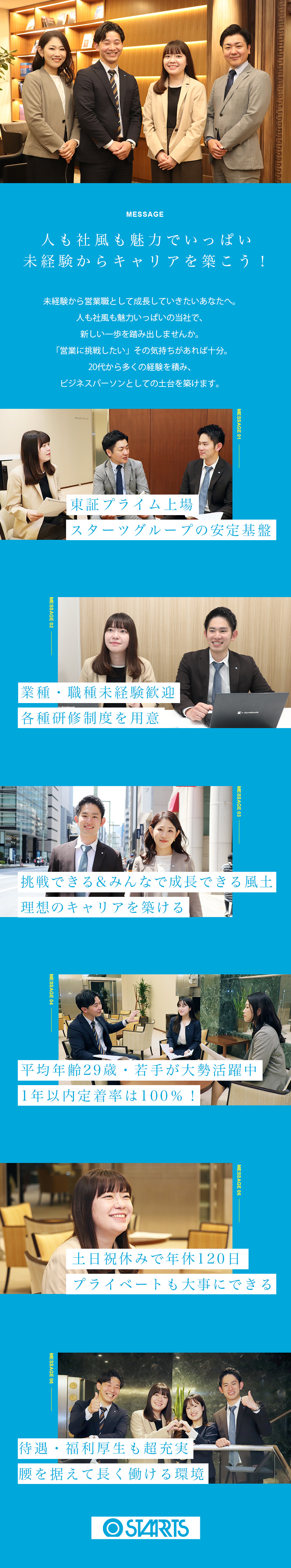 東証プライム上場スターツコーポレーションのグループ会社として、法人に欠かせない不動産関連サービスを手がける同社。業績も非常に好調であり、2025年12月にはオフィスを拡大移転させました。これに満足せず、さらなる飛躍を遂げるために、今回は営業職として働く仲間を募集します。