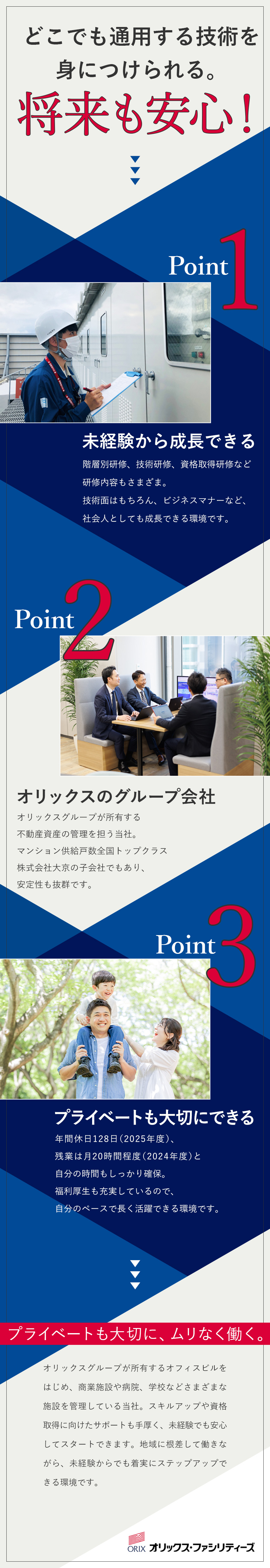 年間休日128日、残業月平均20h程度。オリックスグループの優待制度とは別の約60種の福利厚生も魅力です。転勤もなく、「子育て」「介護」といったライフイベントに合った働き方も全面的にサポートします。