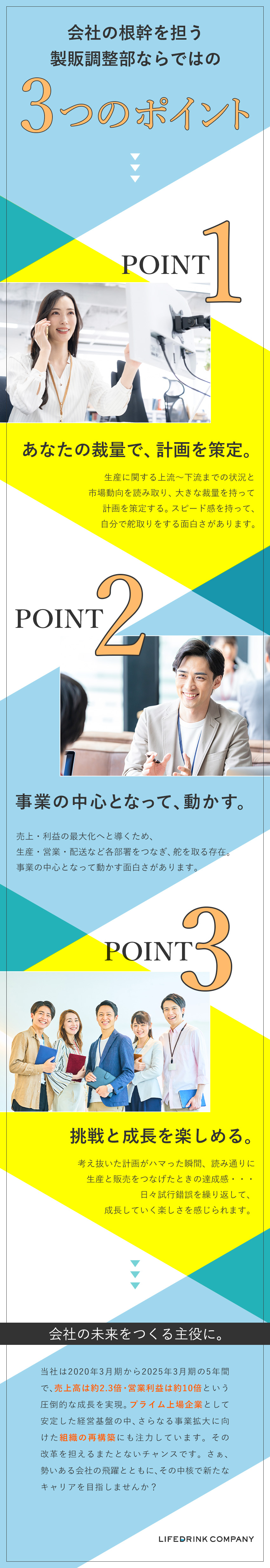 生産・販売の現状を把握した上で、市場の動向を予測し、各所との調整を行い、“未来”への道筋を立てるのが、この仕事です。幅広い部署との連携・やりとりは必要不可欠ですし、常に臨機応変に動く姿勢が求められます。ですが、最初はもちろん、経験豊富な先輩社員にサポートしてもらえますので、心配は不要です。慣れてくれば、自分の裁量で動けるやりがいも感じながら成長していけます。