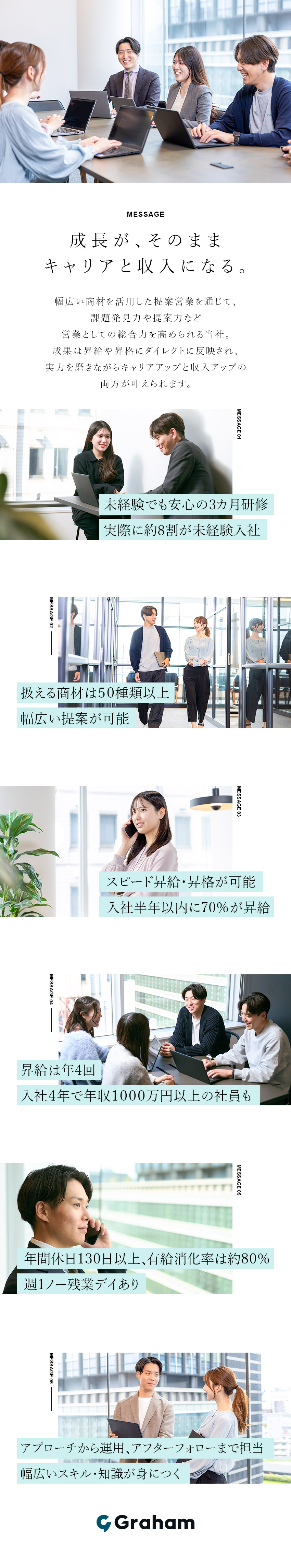 グラハムでは、アプローチするお客様も、提案する商材も、すべて自由に決められます。経営者との商談に臨んだり、前例のない組み合わせで商材を提案したりと、さまざまな経験値を手に入れることができるでしょう。20代を中心とした若手が活躍する様子に刺激をもらい、大きく成長できるはずです。