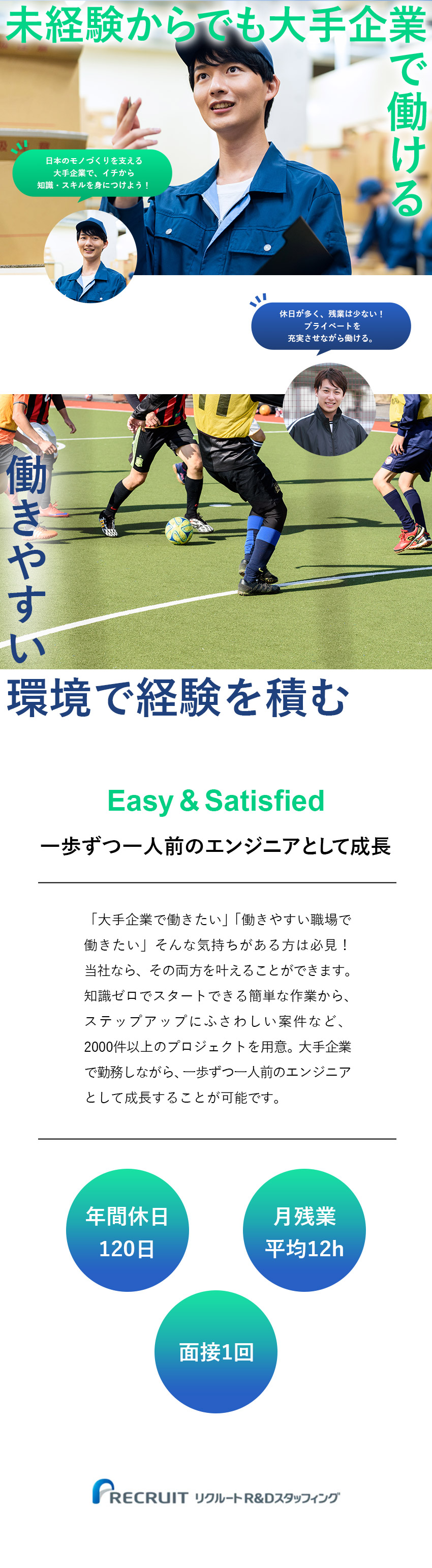 面談では、あなたが挑戦したいことをぜひ教えてください!常時2000以上のプロジェクトがあるので、あなたの適正に合ったお仕事をご用意します。大手メーカーの案件も豊富で、モノづくりの醍醐味を味わうことができます。また通信教育や資格取得支援といったスキルアップ制度などもご用意していますので、経験の有無に関わらず着実に知識やスキルを身に付けていけるでしょう。