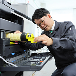 業務用コピー機などのセッティングについては、先輩社員はもちろん、さらに経験を積んだサービス社員がイチから指導します。