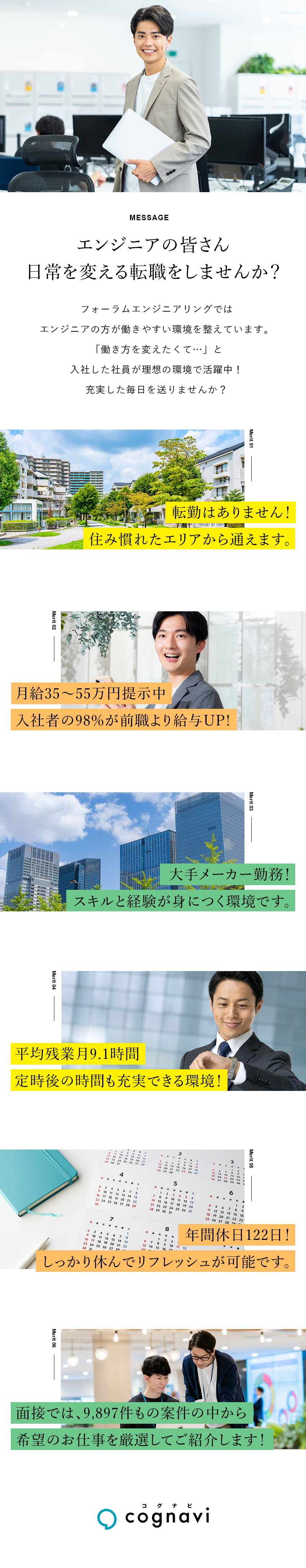 「土日休みの働き方にしたい」「転勤はもうしたくないな」「残業は少なめがよくて…」こういった希望をきちんと聞き入れてくれるのが、フォーラムエンジニアリングの魅力。自分が働く上で大事にしたい条件を叶えつつ、大手メーカーを中心とする優良企業で働けることは、大きなやりがいと満足につながるでしょう。