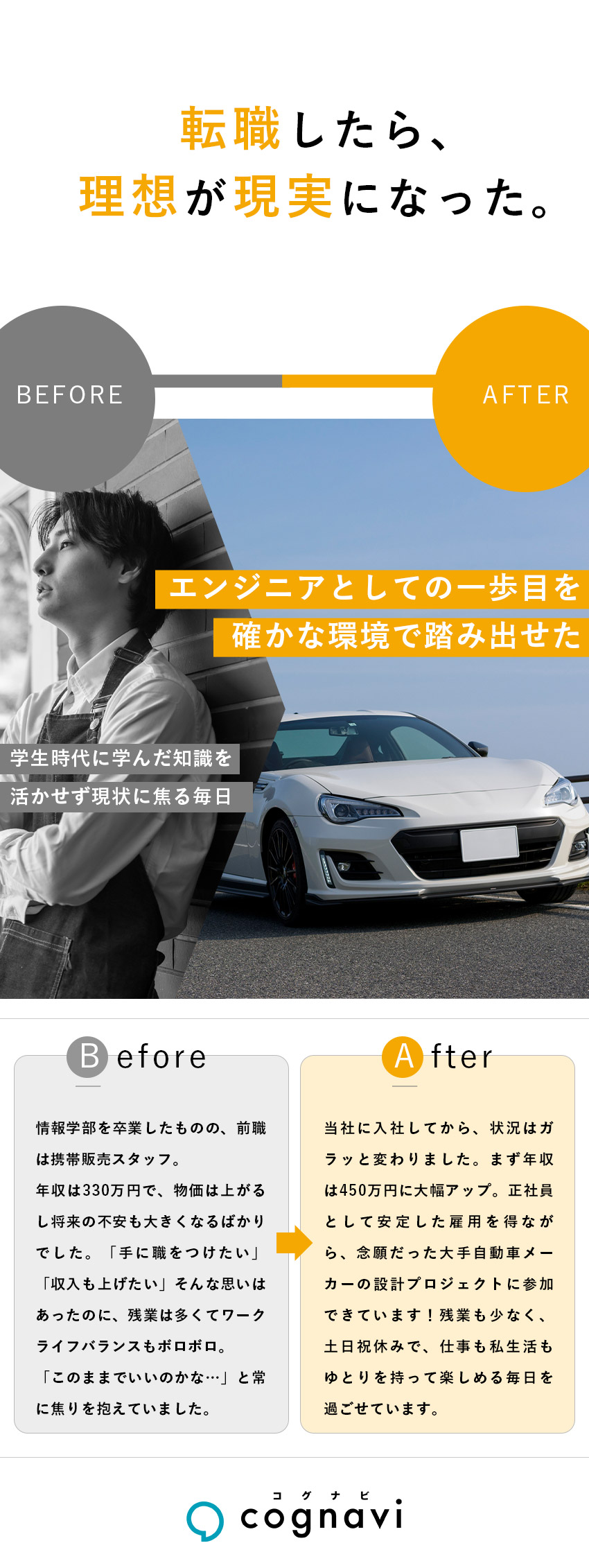 前職経験を活かして給与アップしたいと思い、応募しました。現在は希望通り大手メーカーで自動車内装部品の設計の仕事をしています。給与アップとスキルアップ、両方叶えることができて満足しています。