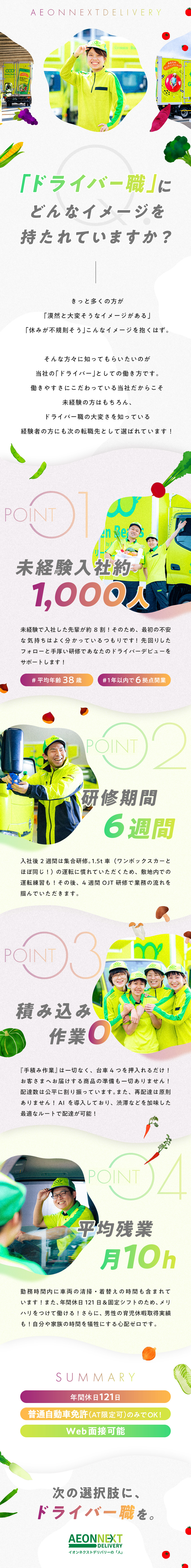 お客さまから感謝の言葉をいただくことも多く、配送を通じて、誰かの役に立てるやりがいを日々実感できる仕事です◎それだけではなく、働く環境の良さも同社の自慢!AIを駆使し、ドライバーの業務負担軽減に取り組む姿勢や風通しのいい温かな社風、年間休日121日・残業月20時間など働きやすさへのこだわり、研修充実・賞与年2回といった好待遇など、イオングループだからこそ実現できる環境下でキャリアアップできます。