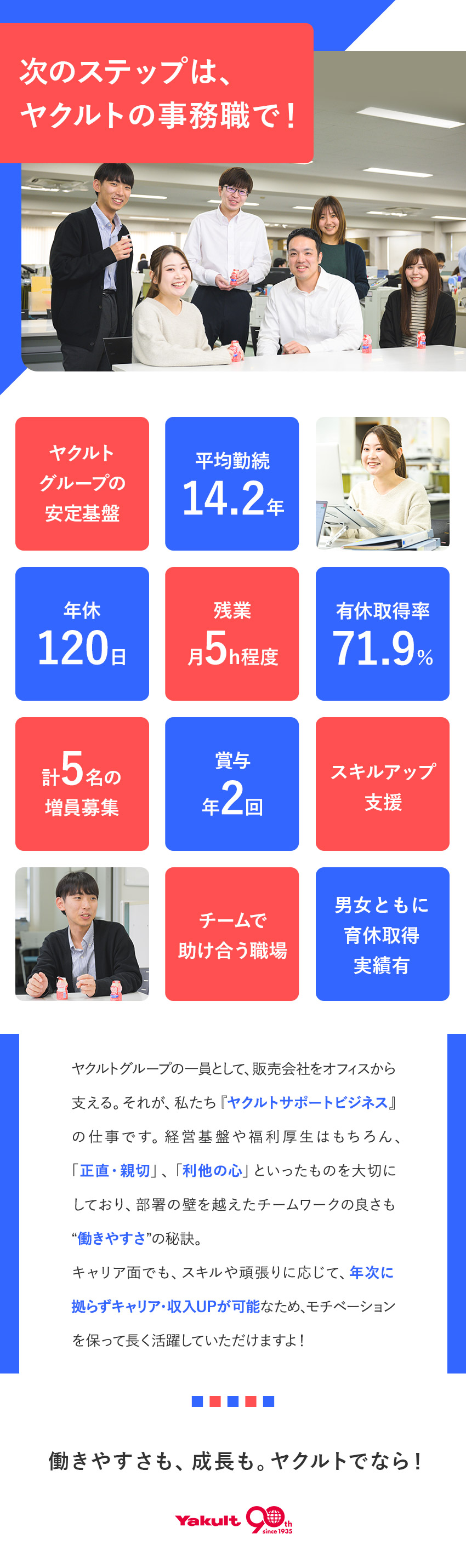 誰もが知るヤクルトをバックオフィスから支える企業として、高い安定性を誇る同社。今回の事務職募集では「一定以上のスキル」を必要とするものの、より重要なのは「チームで助け合える人柄」といえます。