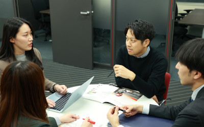 社内の制作・外注先のデザイナー・プランナーなど、多くの人と関わる仕事です。だからこそ必要なのは「自分の考えを持ち、それを相手に伝えられること」。現在活躍している社員の共通点でもあります。