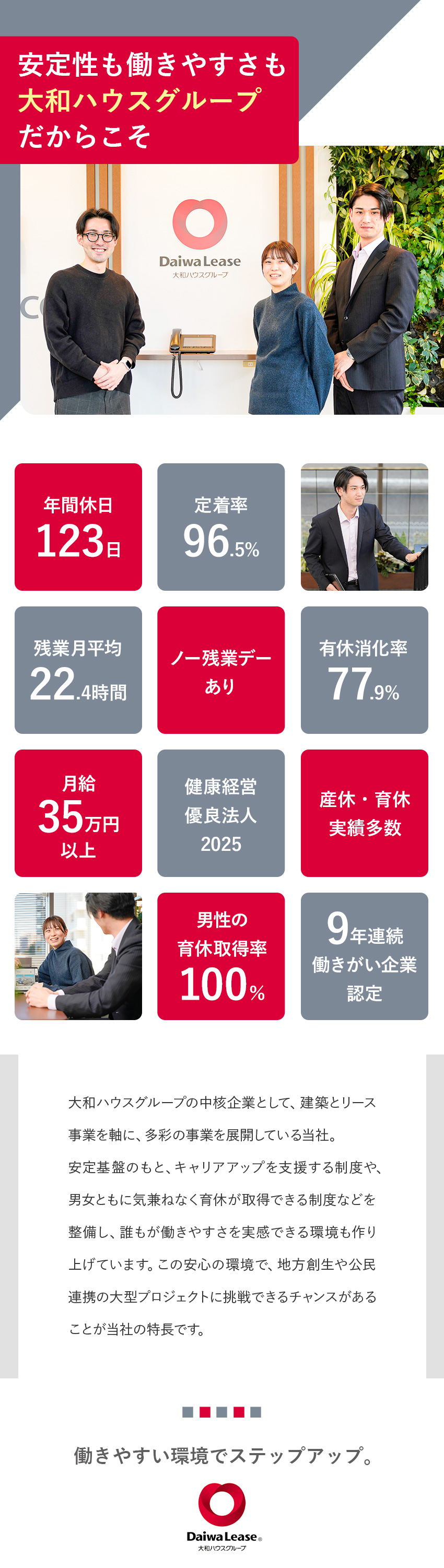 大和ハウスグループの安定基盤だからこその待遇と賞与で社員満足度が高く、直近1年の定着率は96.5%。