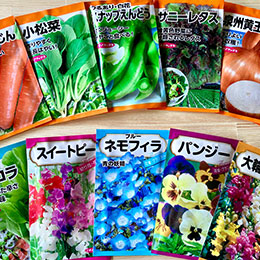 自社ブランド『ニチノウのタネ』をはじめ、タキイ種苗株式会社他、各メーカーの種子を全国ネットでお届けしています。インテリアとして家庭菜園を楽しめるキッチンガーデンシリーズや、お客様の菜園の規模に合わせて種の量を選べる「選べるシリーズ」などを展開。近年は取引先の要望に応えたPB商品への取り組みも行っています。