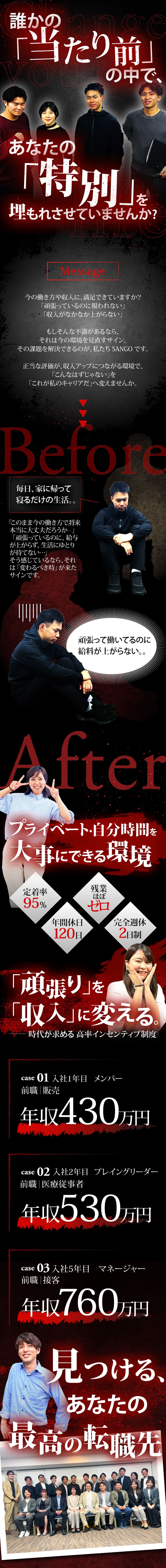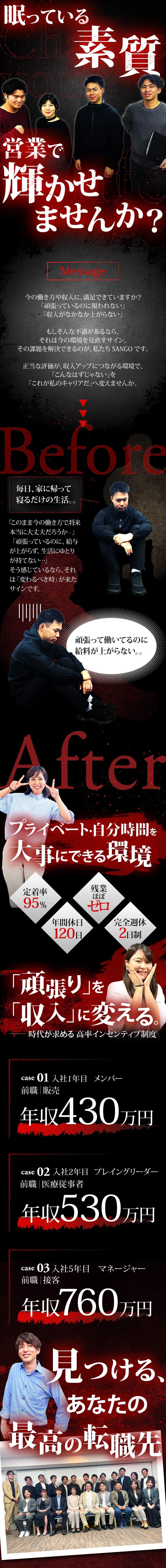 当社ならそんなチャレンジも可能。誰もが頑張ればフェアに評価され、チャンスが得られるのがSANGO。ここであなたの「なりたい」を実現してください!