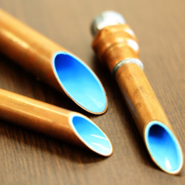 給湯銅管内の不純物を除去し、再生を可能にした特許工法。銅管を研磨せずに特殊専用フラッシング剤で処理します。